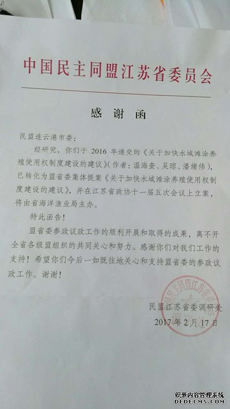 日前,民盟江苏省委调研处发来感谢函,连云港民盟提交的《关于加快水域滩涂养殖使用权制度建设的建议》调研报告,已转化为民盟江苏省委集体提案,并在江苏省政协十一届五次会议上立案,将由省海洋渔业局主办。